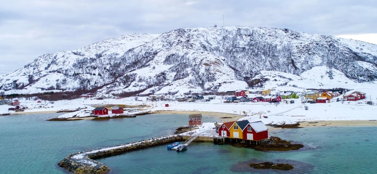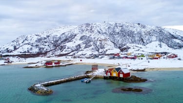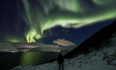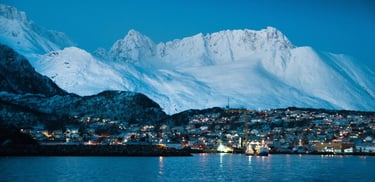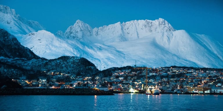 Tromsø sits well above the Arctic Circle, where sheltered fjords attract huge herring migrations from late October to January. Orcas and humpback whales follow these fish into the fjords, creating one of the Arctic’s most reliable whale gatherings. The calm waters make their behaviour easy to observe. Winter brings cold, clear conditions with temperatures hovering around freezing, moderated by the Gulf Stream. During this season, daylight is limited to about two to four hours of soft blue twilight, while long nights often offer clear skies for the northern lights.