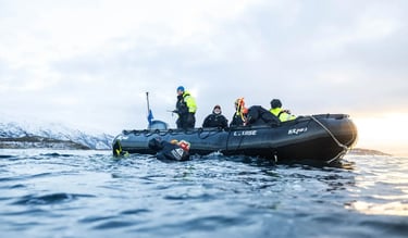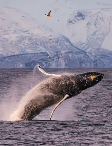What makes this trip truly special is the on-board whale expert: someone who can point out each whale, share their stories, and explain the rhythms of life in these icy waters. With their guidance, every sighting becomes a story, every dive a lesson in wonder. Join us! Come experience the Arctic in a way that stays with you long after the fjords fade behind you.