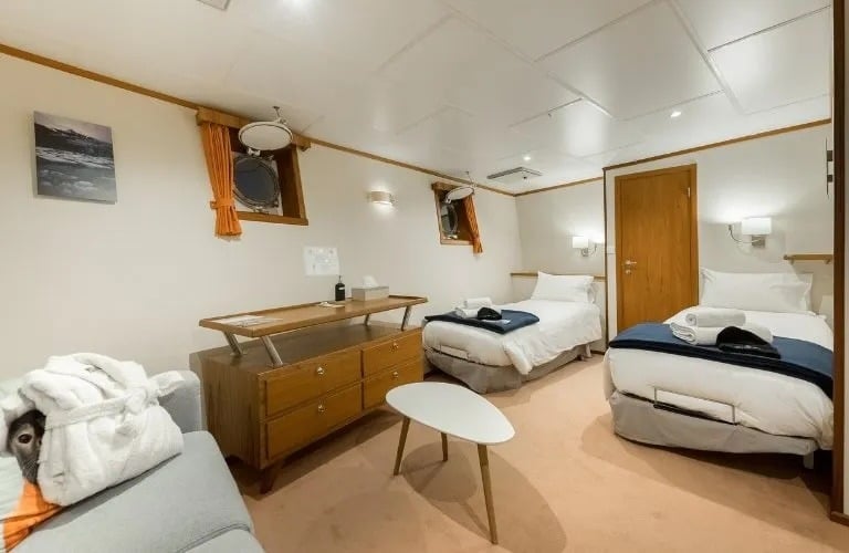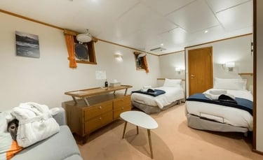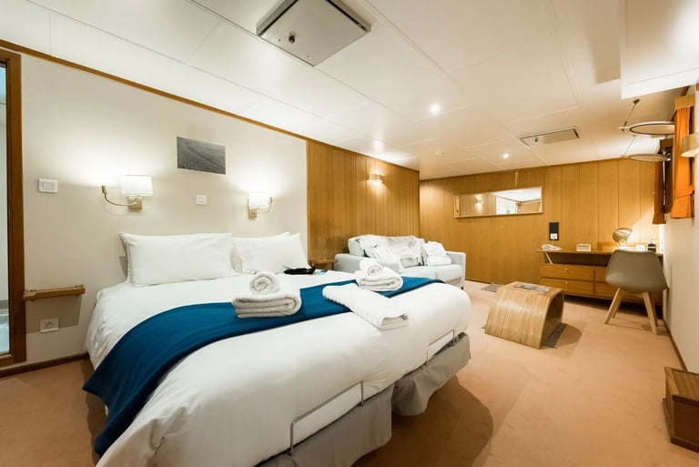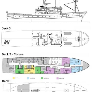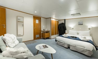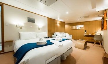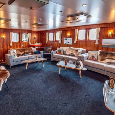 The vessel carries 16 guests in 8 spacious suites with private bathrooms, heating control, and essential amenities. Shared cabins are available on request. Relax in the lounge, library, or dining area, or unwind in the panoramic sauna and hot tub after a chilly day on deck.