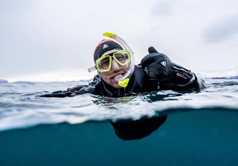 A full snorkeling package from Waterproof Sweden is supplied, including a drysuit, thermal overalls, neoprene hood, gloves, marine boots, fins, mask, and snorkel. Drysuits are essential for staying warm and dry; wear insulating layers underneath. Sizes range from S to XXL. If you’re unsure about fit, bringing your own tested drysuit is recommended. You may also bring your own 7mm wetsuit if you prefer not to use a drysuit.