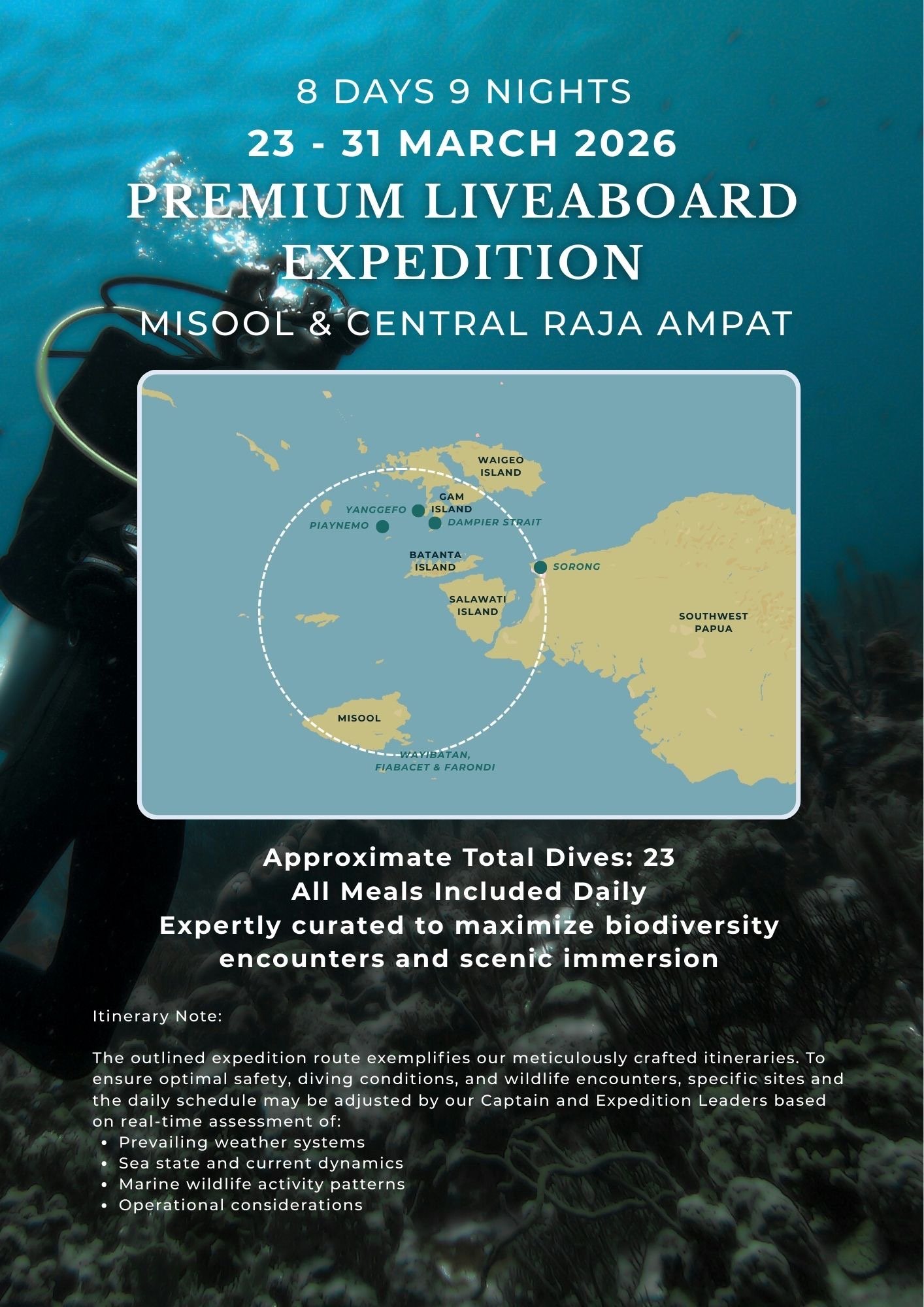 The outlined expedition route exemplifies our meticulously crafted itineraries. To ensure optimal safety, diving conditions, and wildlife encounters, specific sites and the daily schedule may be adjusted by our Captain and Expedition Leaders based on real-time assessment of: