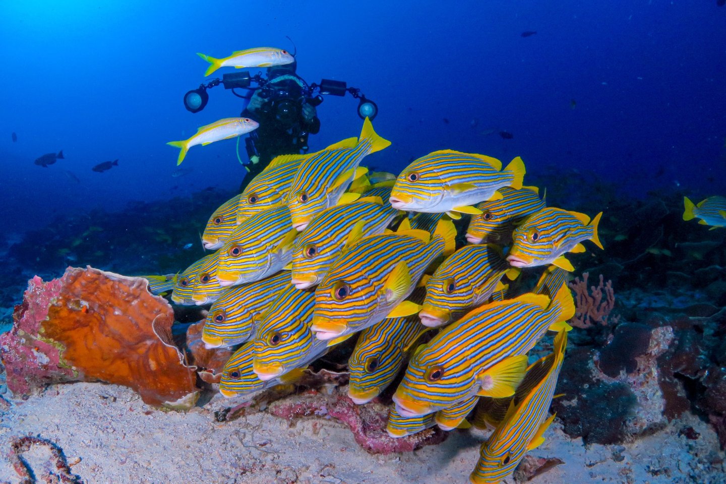 Dives (4): Citrus Ridge (schooling fusiliers, citrus soft coral), Mangrove Ridge (nursery species), Mayhem (underwater pinnacle, schoolings), Gam Ridge (shark alley)