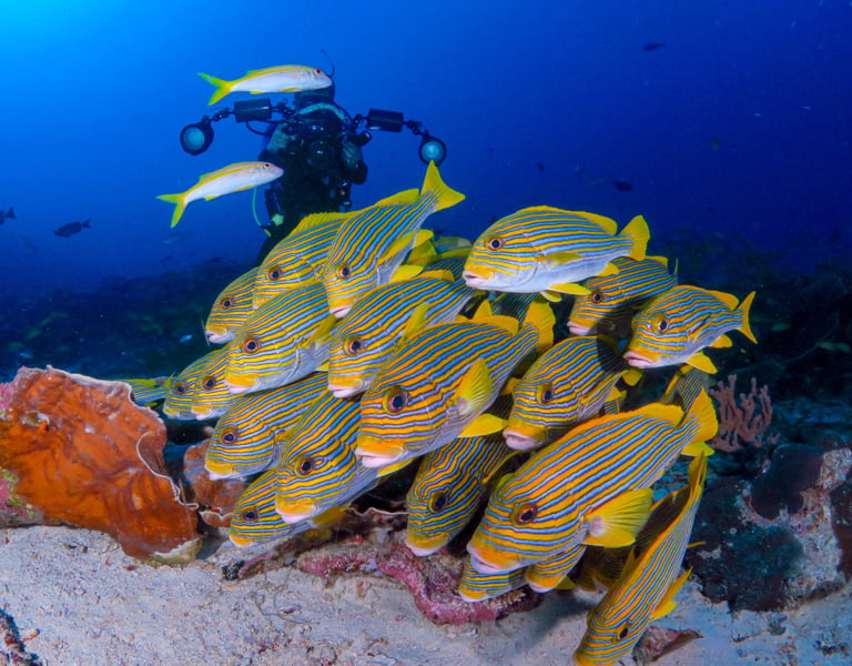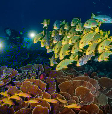Raja Ampat delivers some of the most spectacular diving on the planet, where vast coral gardens, towering pinnacles, and current-swept channels come alive with an astonishing variety of life. Divers can glide alongside manta rays at cleaning stations, watch swirling schools of fusiliers and barracudas, or marvel at the intricate details of pygmy seahorses, nudibranchs, and ghost pipefish. Every reef feels like a kaleidoscope, with more than 500 coral species creating habitats for over 3,000 kinds of fish. From gentle drifts through sheltered lagoons to adrenaline-filled dives in nutrient-rich currents, Raja Ampat offers a balance of grandeur and intimacy that few places on Earth can rival.