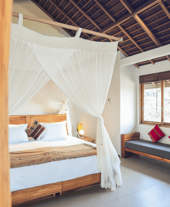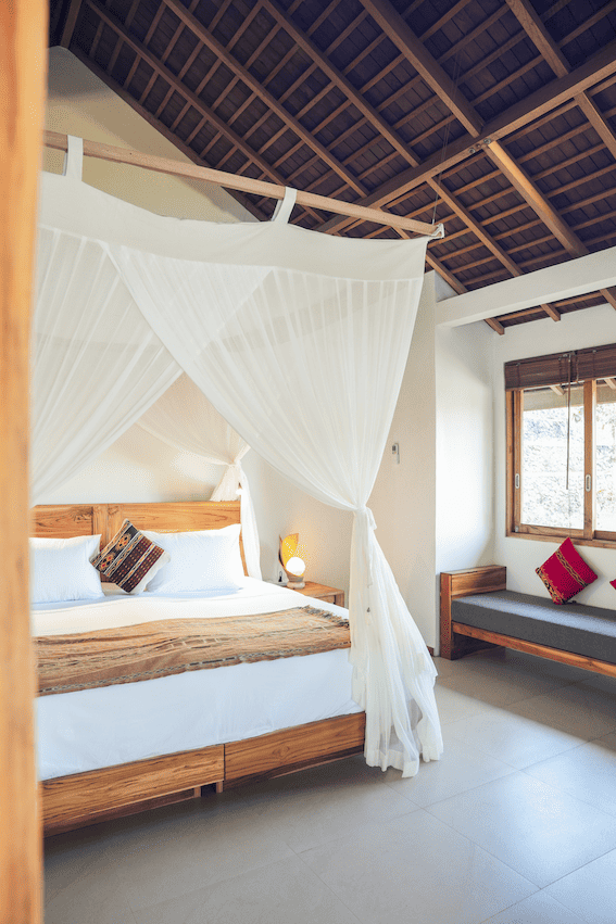 The bungalows have a king-size bed, a private spacious terrace with sofas and a hammock, and the open-air bathrooms feature an outdoor shower with hot water, a double vanity and western-style toilet.