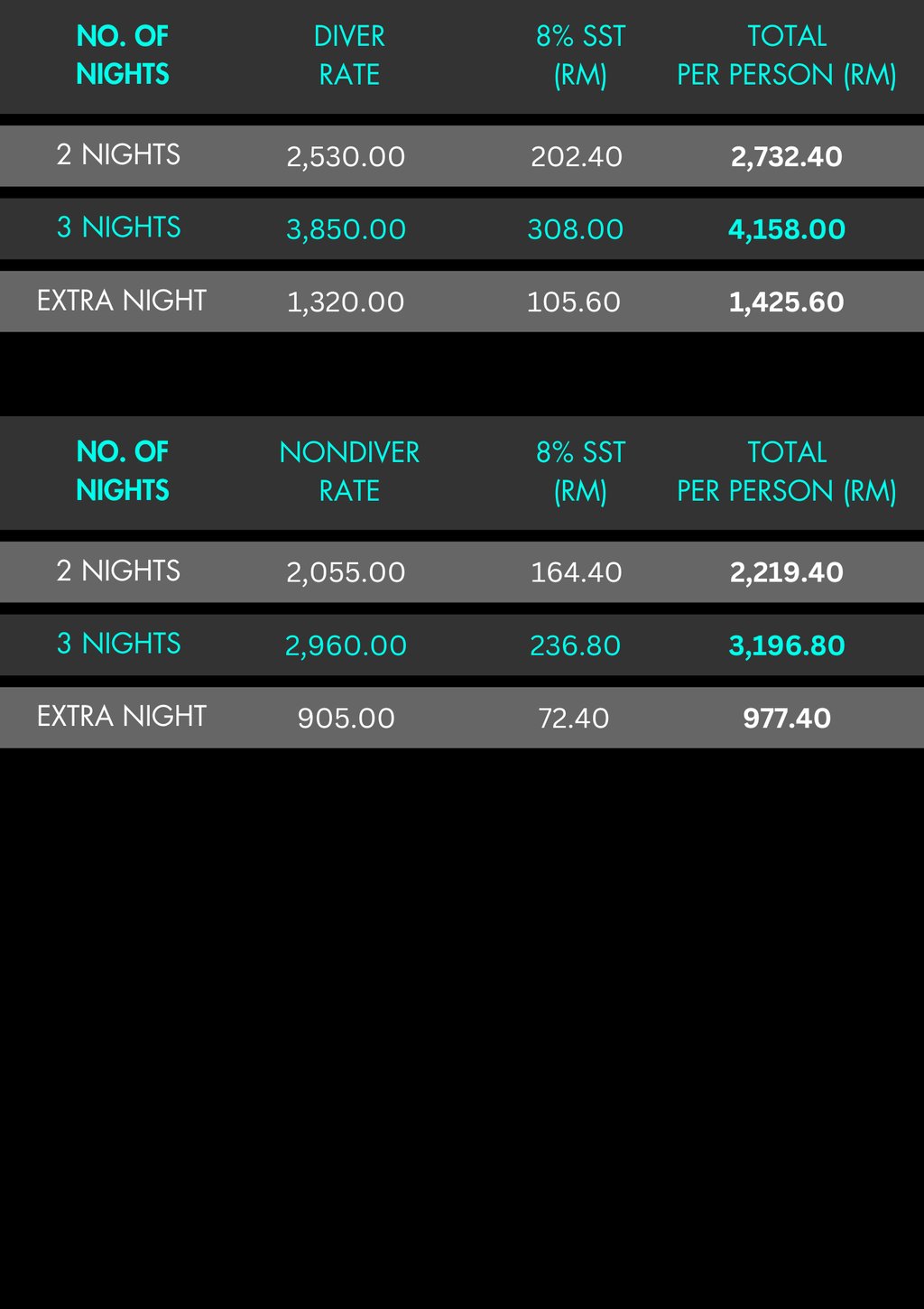 Prices are quoted per person, in Ringgit Malaysia (RM), for Malaysian citizens and expatriates holding a valid Malaysian work permit.
