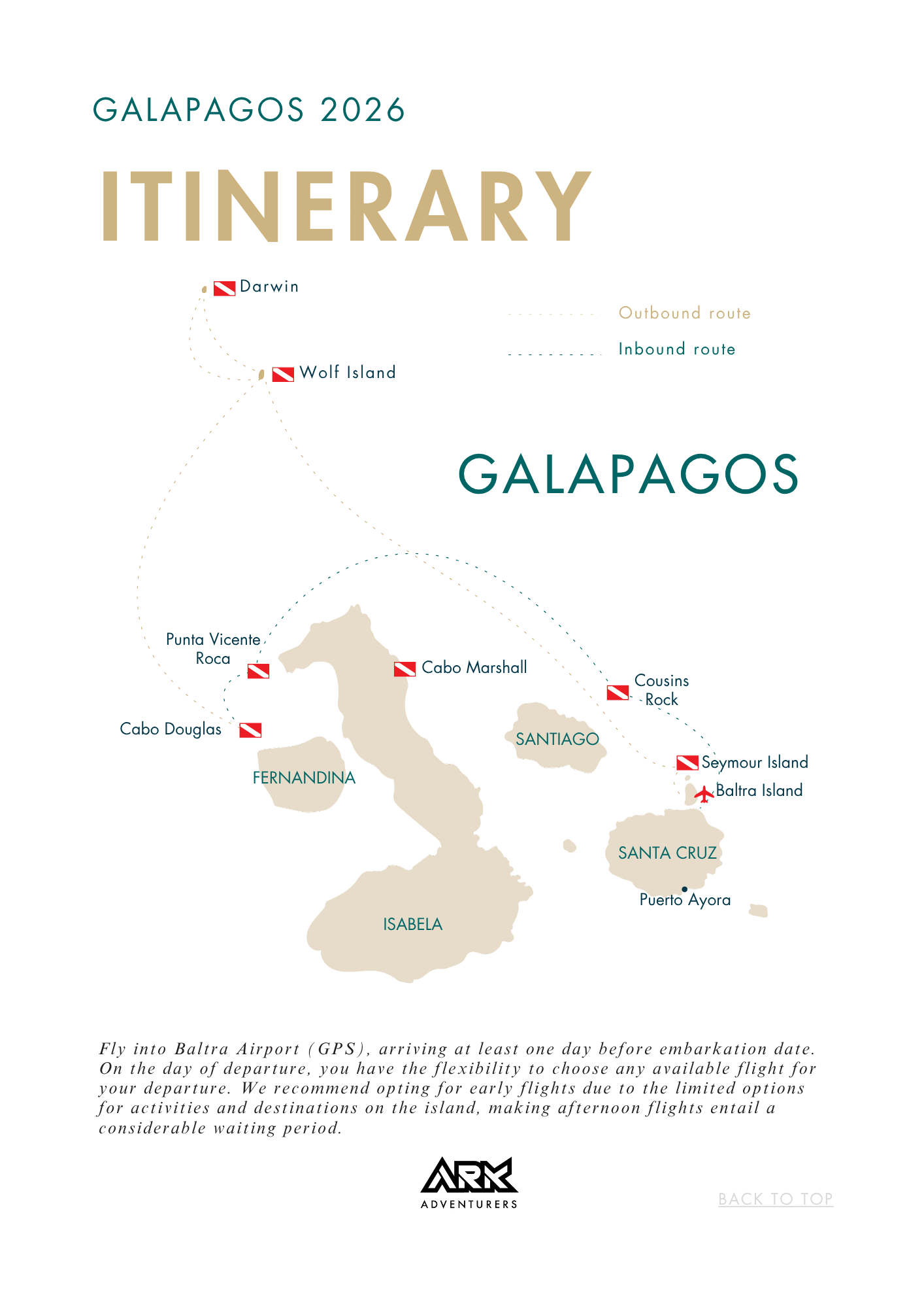 Guests fly to the Galapagos Islands from Mainland Ecuador, arriving in the late morning (please make sure to land in Baltra not later than 11:30am). The dive guides will meet the guests at the airport between 11:00 am and 12 pm and escort them to the Galapagos liveaboard, Tiburon Explorer. Guests will board the vessel, have lunch, organize equipment and listen to the safety briefings.
