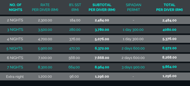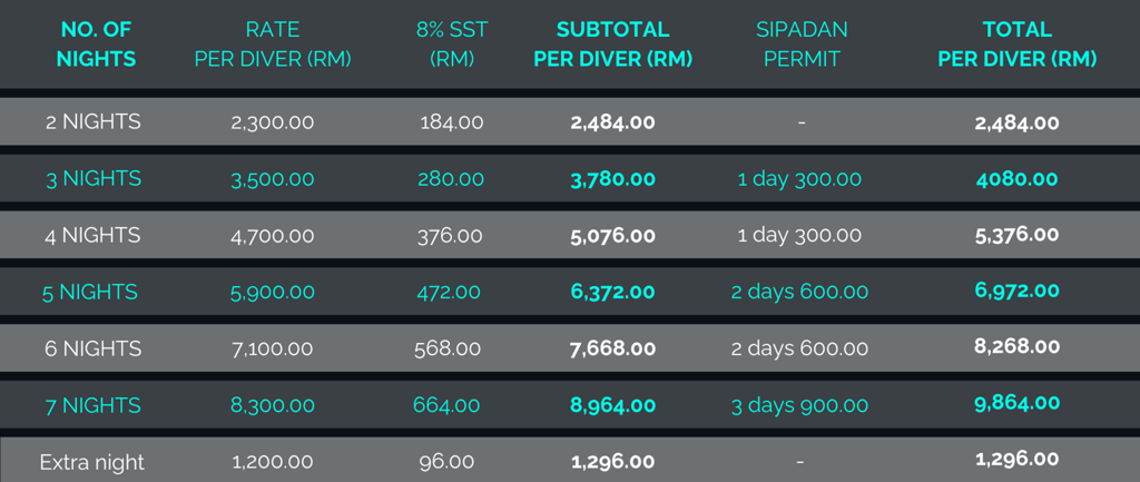 RM980.00 for additional Sipadan diving day (including Sipadan permit).