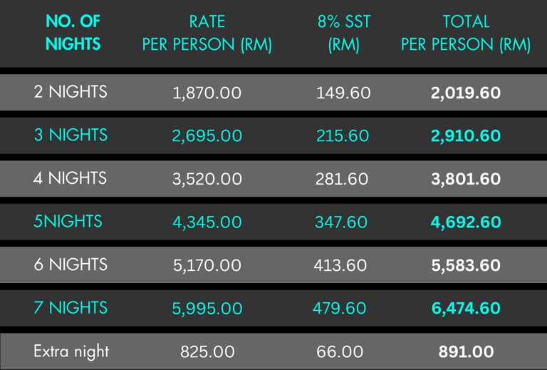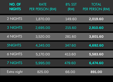 Prices are quoted per person, in Ringgit Malaysia (RM), for Malaysian citizens and expatriates holding a valid Malaysian work permit.