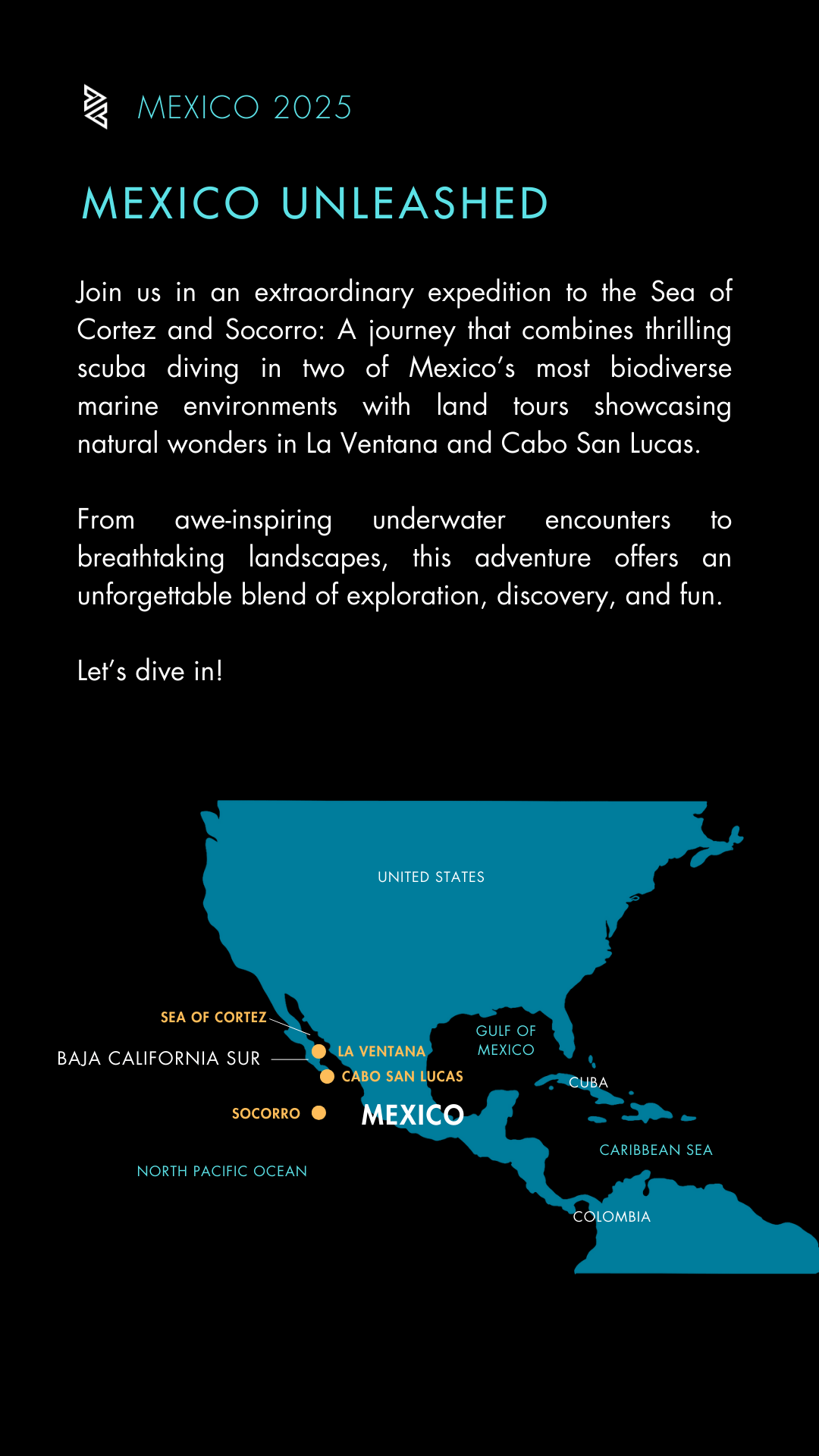 Join us in an extraordinary expedition to the Sea of Cortez: A journey that combines thrilling scuba diving and snorkeling in some of Mexico's most biodiverse marine environments with land tours showcasing natural wonders in La Ventana and Cabo San Lucas.