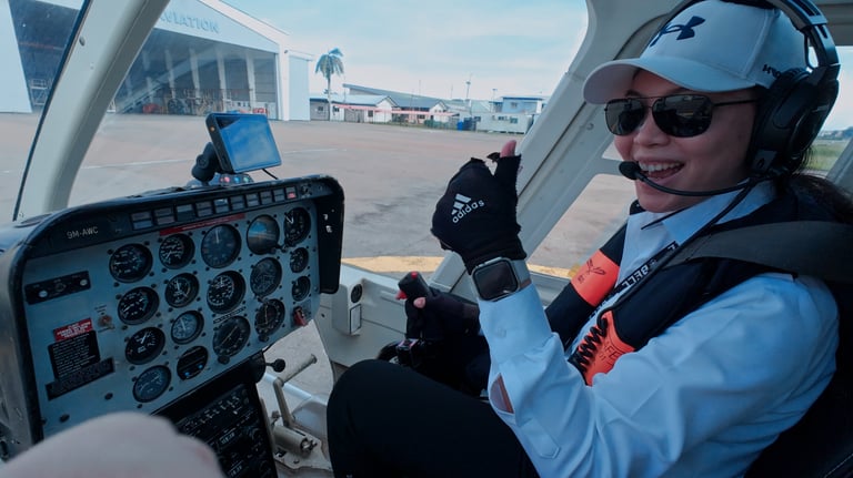The day started early. Just a short drive from the city center, Sabah Air Aviation operates adjacent to Kota Kinabalu International Airport. We arrived at the hangar at 7 AM, where after registration and a quick safety briefing video, two other guests and I were led to the runway. There, we caught our first glimpse of our ride—the sleek Bell 206 Helicopter—and met our pilot, Captain Sofia William, who immediately put us at ease with her warmth and confidence.